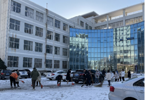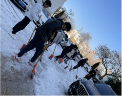一铲一挥一扫,原本有很多积雪的地面干净了不少。很多地方被车轧过,结了一层厚实的冰黏在地上,给清理工作造成很大的困难,但是大家不怕冷、不怕累,铲不动的地方靠男生“大力出奇迹”,土木楼下响起了此起彼伏的铿铿声。大家团结协作,顶着零下十几度的寒风,干劲十足、热火朝天,历经一个多小时终于铲出了一条没有冰雪的路。