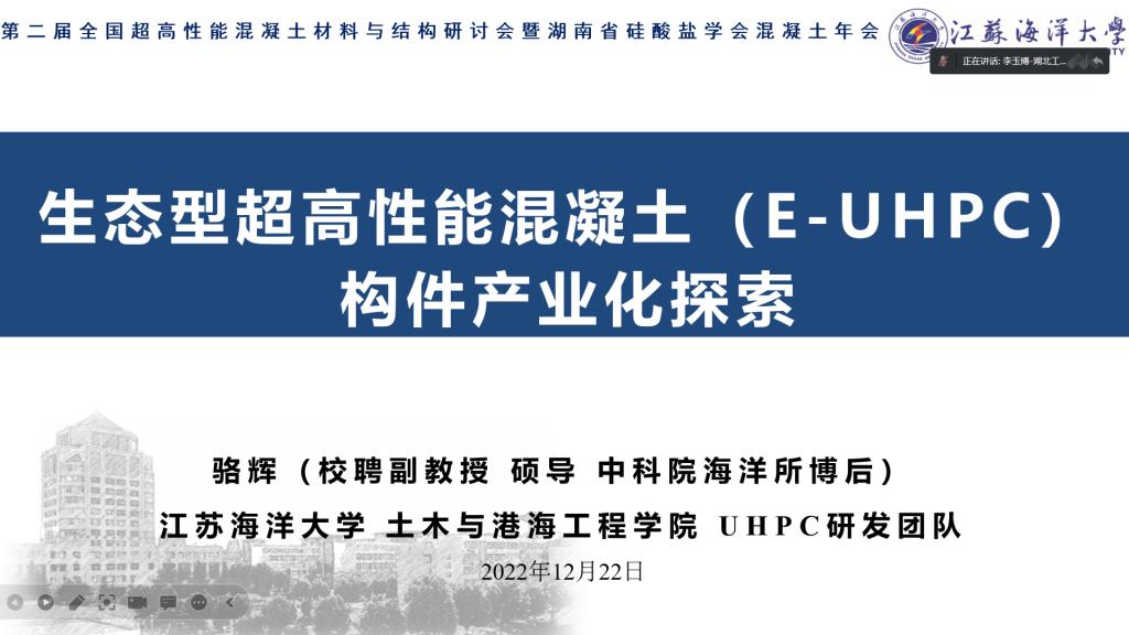 开幕式上刘加平院士、史才军教授、邵旭东教授、王景全教授以及金祖权教授等做了精彩的专题报告。公司固废资源绿色循环利用研发团队骨干教师骆辉博士在团队支持下参加了此次学术研讨会,骆辉博士受邀做了题为《生态型UHPC构件产业化探索及早期收缩性能研究》的报告。会议期间,骆博士与相关高等院校、科研院所以及相关企业的参会代表进行了充分的讨论与交流,并介绍了我团队的现有研究方向以及超高性能混凝土研究与应用方面的相关成果,其部分观点得到了与会专家的高度认可。本次大会,既促进了我团队与国内学者的相互了解和沟通,也促进了我团队在超高性能混凝土领域的进一步发展。