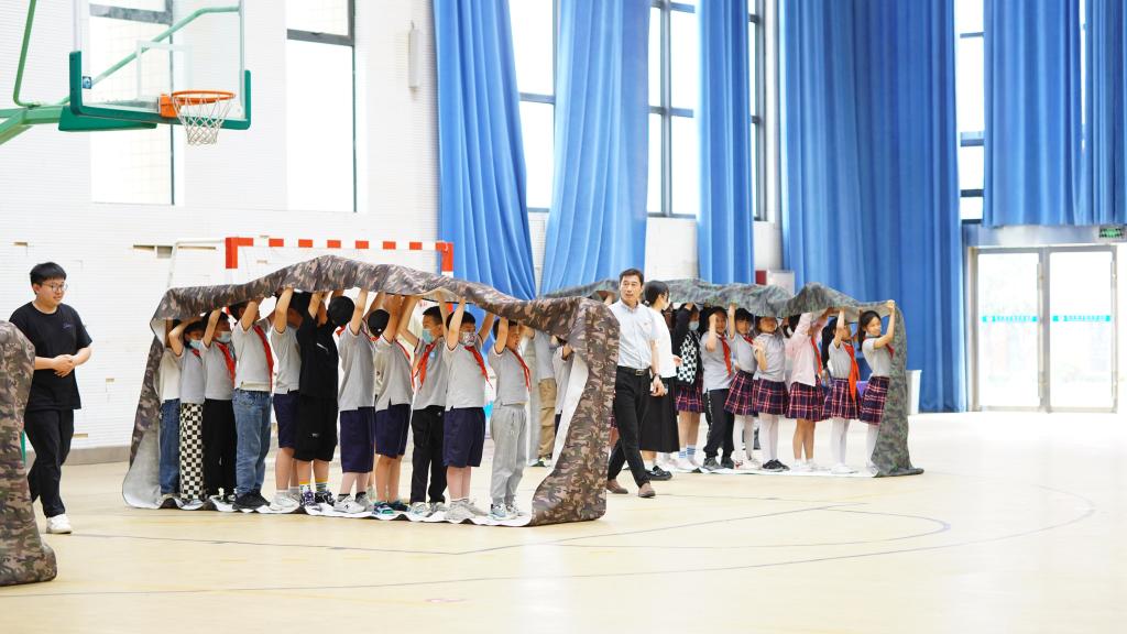 思政课后,大家来到海州湾小学体育馆开展素质拓展活动。“同心鼓”多人协作类游戏中同学们灵活矫健,又专注同心,紧紧牵起的不仅是鼓绳,更是他们每个人团结一致、永不放弃、勇于拼搏的心。“车轮滚滚”游戏中,同学们认识到成功不是取决于履带有多坚固,而是取决于大家的脚步有多一致,依靠团队才是活动的意义所在。在“重走长征路”活动中同学们模拟按长征路线图依次经过长征重要事件发生区域,突破层层关卡,培养了同学们团队配合能力,加强协作精神。