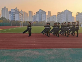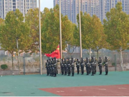 国旗仪仗队迈着整齐划一、铿锵有力的步伐,护送着五星红旗正步走向旗杆。全体师生面向国旗肃立致敬,随着激昂的国歌响起,师生们注视着五星红旗冉冉升起,在熠熠晨光中迎风飘扬。