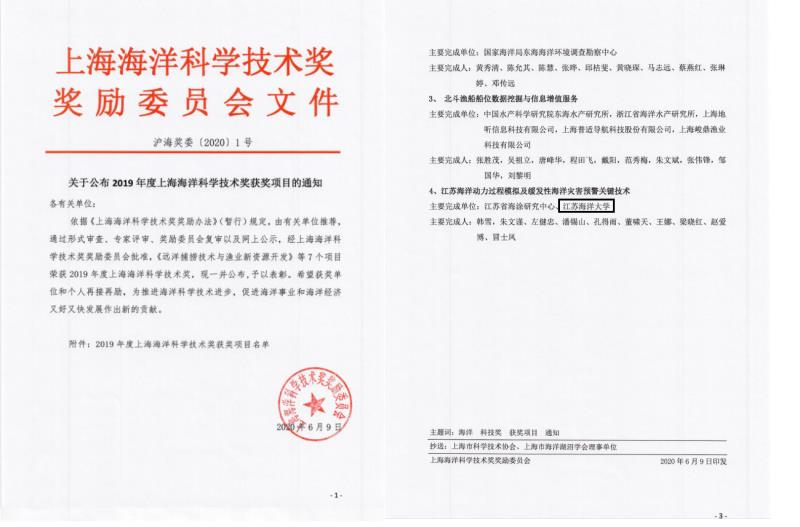 该奖为大海区海洋奖,参评单位主要来自上海市、江苏、浙江和福建省的海洋科研院所。经过层层评选,公司科研团队研究的“江苏省海洋动力过程模拟及缓发性海洋灾害预警关键技术”科研成果,获得“2019年上海海洋科学技术奖二等奖”。此次获奖是业界对公司科研团队在海洋科学技术领域取得的成绩给予的肯定。