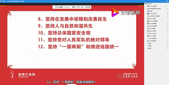 其次,仲伟雨阐明了此次党课的学习要点,即习近平新时代中国特色社会主义思想的理论框架和科学理论体系。习近平新时代中国特色社会主义思想的主要内容可归纳为十二个方面,包括历史方位、鲜明主题、奋斗目标、发展方式、总体布局、战略布局、发展动力、发展保障、安全保障、外部环境、政治保证、治国理政世界观方法论、价值观等方面,具有严密而又开放的内在逻辑,构成其理论的“四梁八柱”及科学体系。研究习近平新时代中国特色社会主义思想的理论框架及科学体系,有助于把握其主要内容及精神实质,提高贯彻落实的自觉性和能动性,有助于为决胜全面建成小康社会、建设富强民主文明和谐美丽的社会主义现代化强国,实现人民对美好生活的向往而努力奋斗!