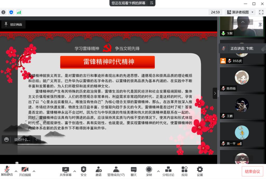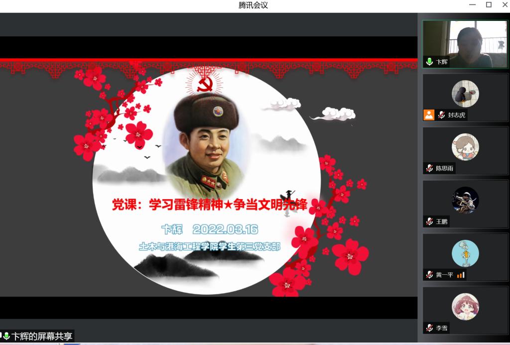 3月16日,为弘扬服务、奉献、友爱、互助精神,学习雷锋事迹,促进同学们的政治思想水平不断提高,传承雷锋同志艰苦朴素的生活作风,伟德国际bevictor1946员工第三党支部在线上开展了“学习雷锋精神,争当文明先锋”主题党课,本次党课由支部书记卞辉老师主持,支部全体党员参加。