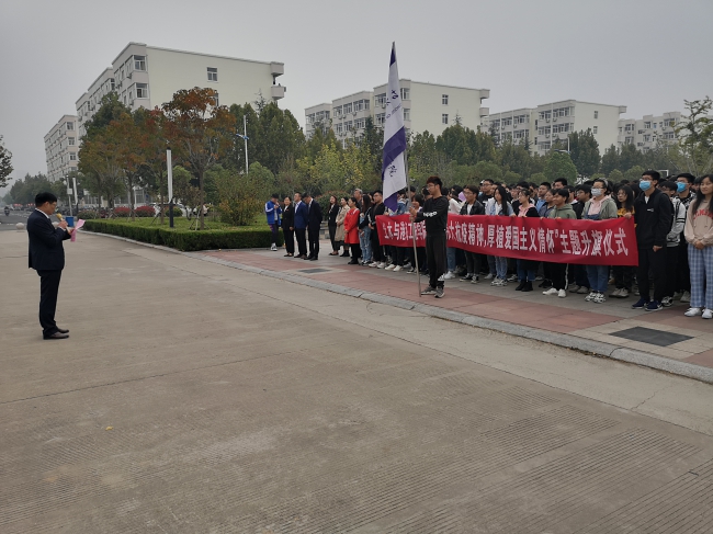 2020年10月12日清晨,伟德国际bevictor1946在苍梧校区四食堂前生活区广场举行“弘扬伟大抗疫精神,厚植爱国主义情怀”主题升旗仪式。学院全体党政领导、辅导员、班主任以及全体同学参加了升旗仪式。公司党委副书记钱汉珍主持升旗仪式。