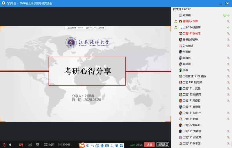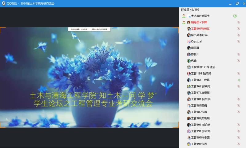 2020年6月20日16:00,2020届工程管理专业考研交流会在QQ群以屏幕分享的形式成功举行。此次工程管理专业考研交流会邀请的主讲人有章逸、刘源鑫、武昌、张燕雨和金歌,他们均是在研究生入学考试中表现优异、成功上岸的同学,参与聆听的同学是大一到大三中有考研意愿或正在备考的同学。