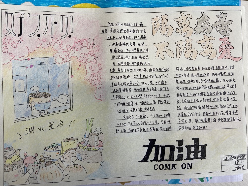 全院同学积极响应号召,利用所学心理健康知识弘扬爱国之情,表达新时代坚守的青年老员工力量,以丰富多彩的绘画形式赞美讴歌抗击疫情一线的民族英雄,展现抗击疫情战中涌现的美好人物和事迹,赞扬人性光辉。本次手抄报的创作内容需积极向上,表达乐观精神,有利于凝聚人心,增强信心,传递正能量,传播正确防控方式和中央关于防控工作的精神和要求。
