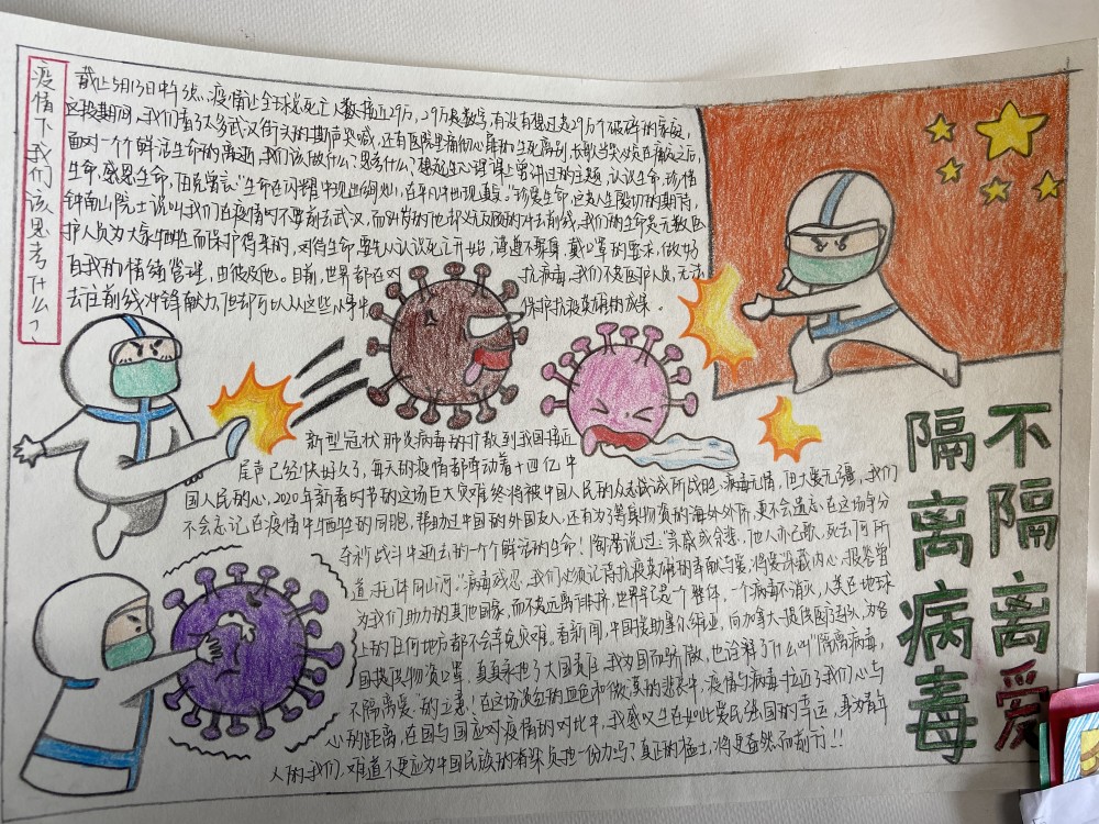 为积极响应上级和公司“防控新型冠状病毒感染的肺炎疫情”的相关政策和部署,为战胜疫情做好基本保障,引导同学们积极做好心理健康建设,公司考虑到当今疫情形势依然严峻,面向全院同学发起以“隔离病毒,不隔离爱”为主题的手抄报作品征集活动。