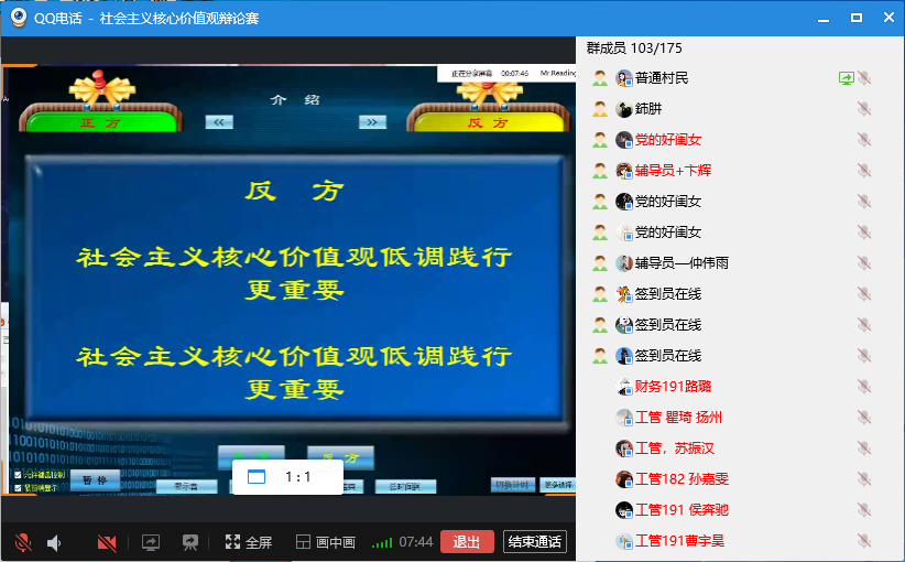 本次辩论赛于2020年4月5日晚7:30在QQ群线上开展。土木木公司辅导员卞辉老师、仲伟雨老师以及海洋资源与环境公司辩论队领队艾志辉担任本次辩论赛的评委,土木公司辩论队队长陶羽航担任主持,共有100多个同学进行线上观摩并参与互动。在赛前,参赛人员利用课余时间精心准备,积极备赛。比赛中,辩论队用犀利的语言,流畅的思路,精彩的发言,针对社会主义核心价值观是高调弘扬更重要还是低调践行更重要进行了讨论。