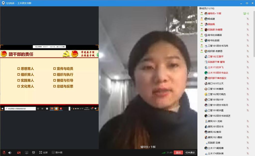 在卞辉老师的深情讲解下,建筑161团支书刘岩表示:作为一名团干部一定要正确把握自己的角色定位,对待工作应认真负责,否则会失去很多真正磨练自己的机会,也会与许多体现自己价值和能力的荣誉擦肩而过。工管172的团支书于林艳主动分享了自己高效工作的一点经验和体会:可以建一个舍长QQ或微信群,针对一些比较重要的工作或活动,可以充分调动和发挥班级宿舍长和班委的作用,并同时邀请班主任或者辅导员在群里做一定的监督和支持,这样可以一定程度上提高工作的速度和效率。