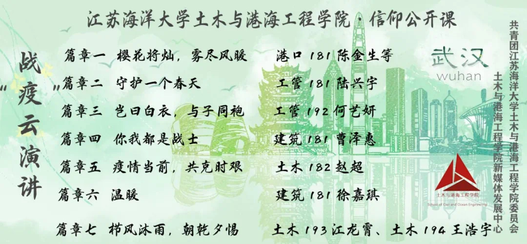 阳春三月,惠风和畅,在新冠疫情这个没有硝烟的战场上,伟德国际bevictor1946于3月10日开始,面向全体基层团支部,依托网络开展“信仰公开课,战‘疫’云演讲”活动。土木学子们充分运用图文、短视频及Vlog等形式,将自己在疫情期间的所见所闻、所思所想,转变为内涵深刻、活泼生动的演讲和记述。经过层层筛选,最终选出了7部作品在公司各新媒体平台上进行展示宣传,以期让广大师生深切感受到土木学子携手战“疫”的发声与作为。