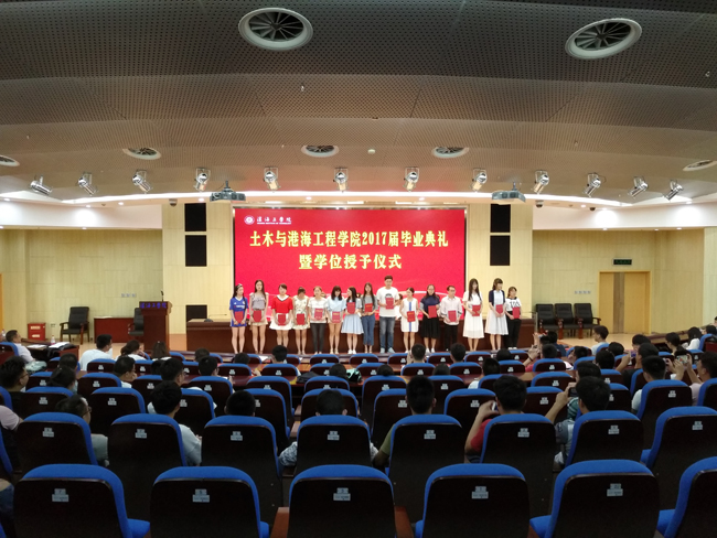 毕业典礼在庄严的国歌声中拉开帷幕。首先,公司党委书记吴建新宣读关于表彰2017届优秀毕业生的决定、关于表彰2017年考研奖的决定;副经理朱文谨宣读2017届毕业生名单及获得学士学位员工名单。宣读名单后,获评2017届优秀毕业生的33位同学上台领奖。