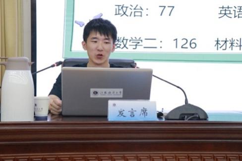 钱汉珍首先向今年考取硕士研究生的61位同学表示祝贺,并阐述了召开此次会议的目的和意义。她指出现在正是同学们青春正酣、努力奋斗之时,希望同学们珍惜此次交流机会,从老师们对历年考研数据分析中,从学长学姐们亲身经历和丰富经验中明确努力方向,清楚复习方法,汲取前行力量。