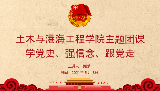 2021年5月8日下午,2020级研究生开展了以“学党史、强信念、跟党走”为主题的团课,主讲人为黄媛老师,地点为土木北楼三楼会议室。