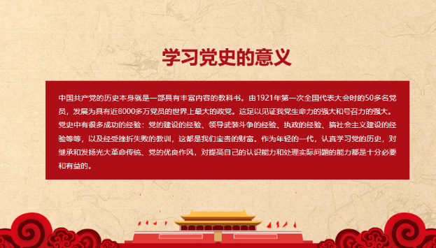 黄媛老师主要讲了新民主主义革命时期、社会主义革命和建设时期、改革开放和社会主义现代化建设新时期的有关党史。历史告诉我们,没有共产党就没有新中国,中国共产党是中国特色社会主义事业的坚强领导核心。
