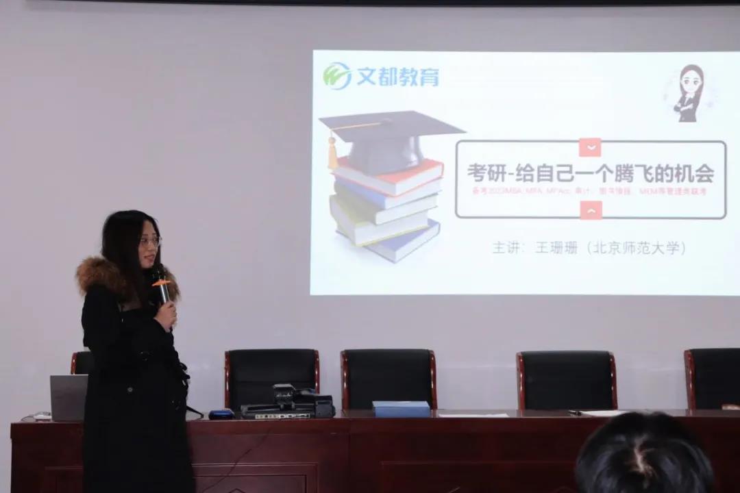 紧接着,王珊珊老师通过大数据,向同学们展示了近几年各高校各管理专业考研的趋势,从本专业学硕考研,跨专业考研和199管理类专硕考研三个方向进行工程管理专业考研的详细解读,客观分析各自的利与弊,并依托几个真实案例向同学们提出了本专业考研的意见和建议。此外,王珊珊老师还在宣讲会中与同学们分享了数学逻辑等题目的做题技巧,鼓舞同学们树立自信心。