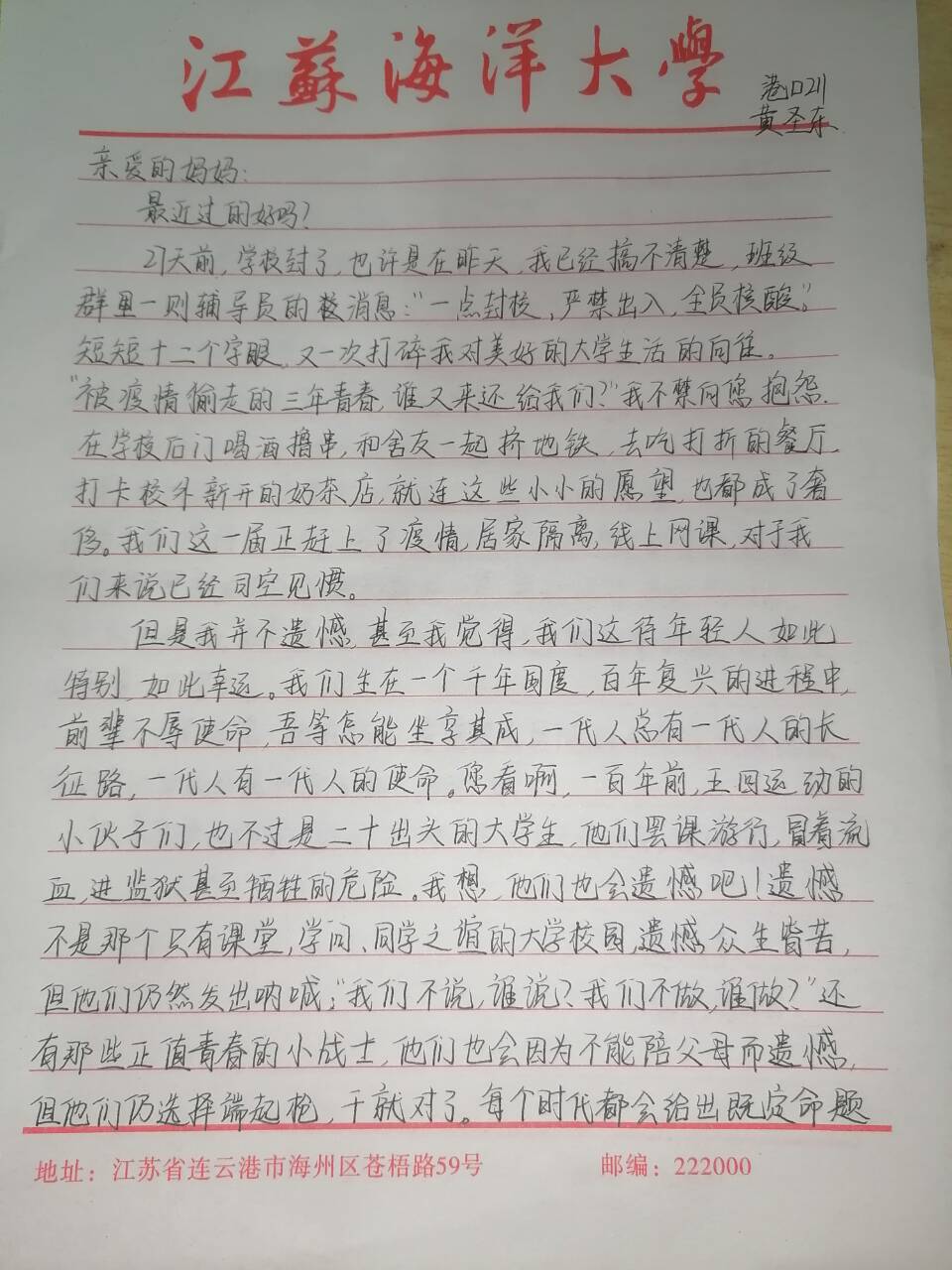 今天,就让我们一起来看看饱含江海大学子思念之情的一纸书信吧!