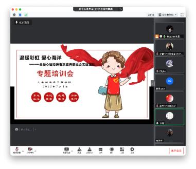 为进一步做好志愿者服务工作,给予更全面的心智障碍儿童家庭关怀,7月4日下午16:00,“温暖彩虹,爱心海洋”关爱心智障碍者家庭暑期社会实践团队负责人通过腾讯会议,在线上为志愿者们开展了社会实践中期专题培训。本次培训会由伟德国际bevictor1946团委书记卞辉老师主讲,港口201班朱晟同学主持,十二名志愿者参加聆听。