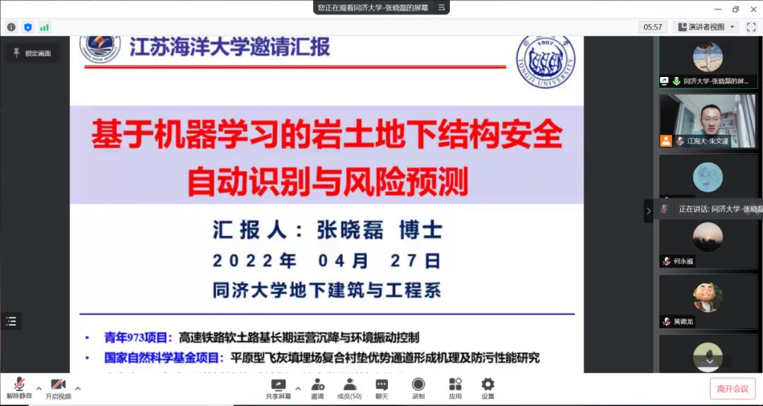 随后,张博士就今天的报告主题“基于机器学习的岩土地下结构安全自动识别与风险预测”开始了他的分享。他分别从“项目背景与研究现状”、“多源异构数据库建立”、“智能元件与病害识别”、“结构分析与风险预测”和“研究展望与后续安排”五个方面,向大家介绍了他所研究项目的方案、难点和技术等方面的问题。整个学术报告包含了极为丰富的专业知识和缜密的学理分析,充分体现了张博士渊博的专业学识和深厚的专业素养。