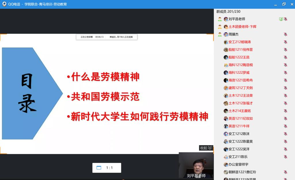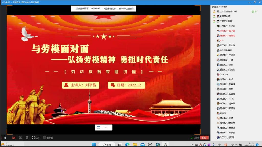 为深入贯彻习近平总书记在全国劳动模范和先进工作表彰大会上的讲话精神,增强同学们的责任感、使命感,焕发劳动热情,12月3日下午,公司与海洋科学与水产公司、外国语公司、环境与化工公司、海洋工程公司共同举办了“与劳模面对面——弘扬劳模精神,勇担时代责任”劳动教育专题讲座。本次讲座邀请了伟德国际bevictor1946教学督导组组长刘平昌教授主讲,五个公司的青马工程培训班全体学员参加,讲座由伟德国际bevictor1946团委书记卞辉老师主持。