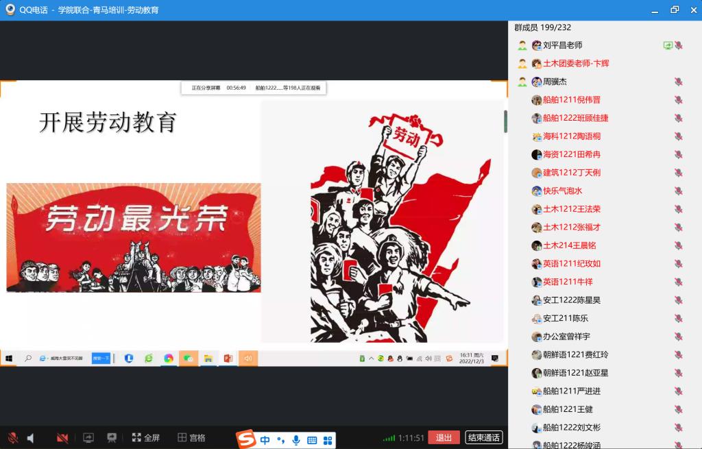 本次讲座,刘教授主要从“什么是劳模精神”“共和国劳模示范”和“新时代老员工如何践行劳模精神”三个方面展开。他强调,劳模精神、劳动精神和工匠精神都是新时代需要大力弘扬的精神,劳模精神具有重大的时代意义同时也是二十大报告强调的重要内容。此外,同学们在刘教授的带领下一起学习了众多典型的劳模事迹,受益匪浅,感受颇深,其中包括“杂交水稻之父”袁隆平,守卫孤岛整整32年的“王继才”,公司员工、“新时代”造纸设备维修技术能手范燚。之后,刘教授借用习近平总书记的话语,殷切希望我们老员工能做到“学”“思”“践”“悟”劳模精神,积极组织和参加劳动教育相关活动,培养责任担当,养成劳动好习惯,用自己的实际行动诠释和践行劳模精神。最后,刘教授呼吁全体青马学员都能向劳模学习,成为新时代的领跑者。