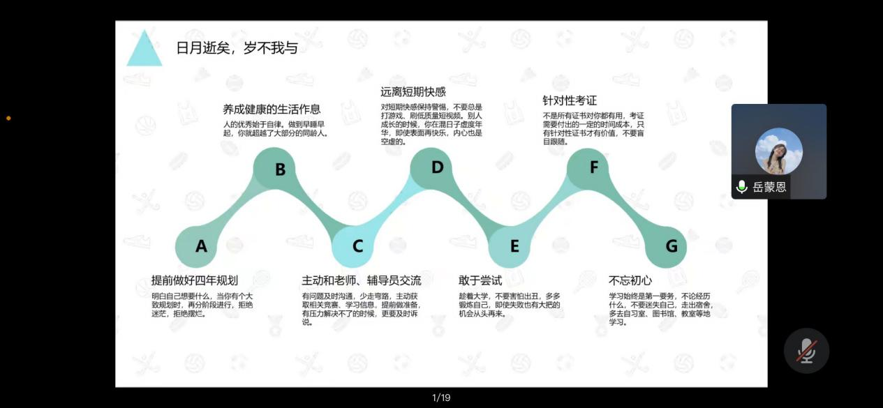 岳蒙恩学姐分别从“知”“立”“践”“得”四个部分分别阐述自己的观点,分享她对大学学习与生活的独到认知和理解,帮助同学们树立正确的人生观、学习观、职业观等。她首先从知己、知势、知出路告诉我们人往往最大的敌人是自己,要懂得顺势而为,可以提前思考自己未来的出路;其次从立德、立志、立目标三个方向让我们懂得做人做事要以德为先,心中有理想,有目标;然后从践学、践责、践社会三个方面结合自己的实际经历为我们生动有趣地描绘“践”的重要性,以及如何做到充分利用时间,找到自己最舒服的状态去尝试新鲜事物。学姐多次说到“我们现在有足够的时间足够的勇气去试错”,所以要更勇敢一些。最后,学姐以得心、得誉、得人生为第四部分告诉我们“人生是自己的”,要学会珍惜,学会改变,学会一些技能,学会笑对人生。