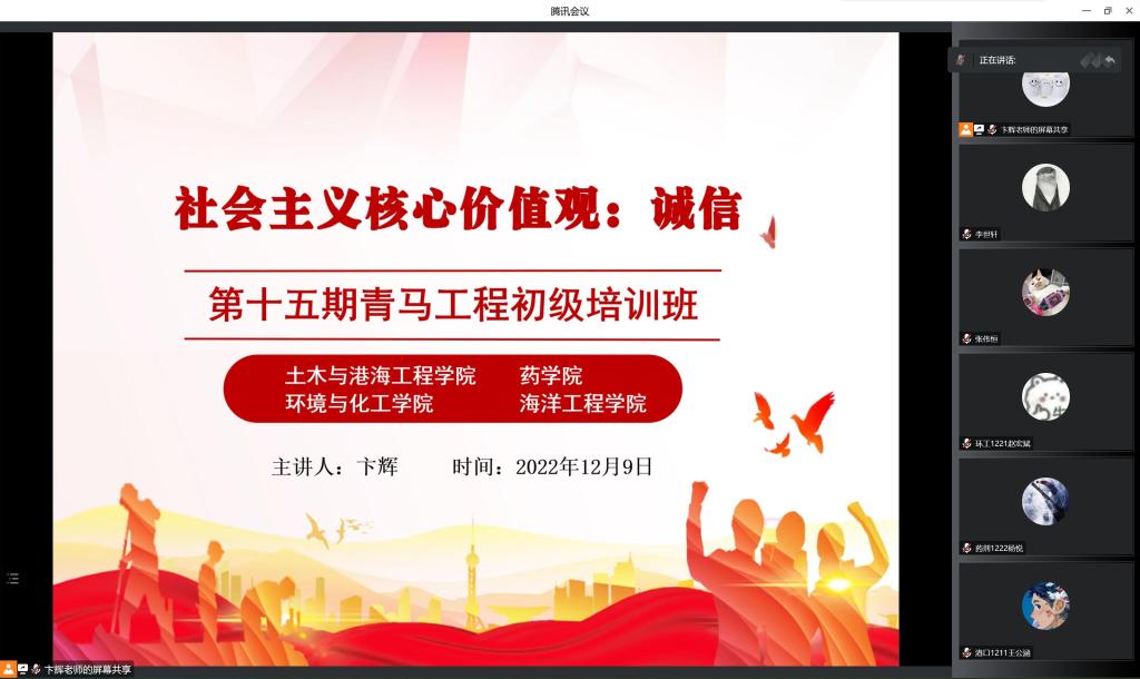 12月9日上午10:20,由公司团委书记卞辉老师主讲的“社会主义核心价值观:诚信”专题讲座通过腾讯会议线上举行。伟德国际bevictor1946、环境与化工公司、药公司、海洋工程公司四个公司的青马班公司共同参加。