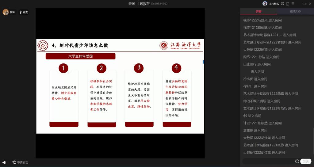 作为新时代的青年人,我们要努力发光发热,以梦为马,不负韶华,誓为祖国的繁荣昌盛撰写新的华章。至此,本次爱国主题教育讲座圆满结束。