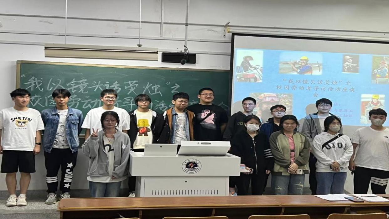 活动最后,由活动评定小组从百余份采访作品中评选出12组优秀作品,并邀请优秀组中的1-2位代表参与座谈交流会。座谈会上,每组或制作PPT或制作视频,热情地分享着自己在校园劳动者寻访过程中的心得与感悟。每个人都对劳动有了新的认知与理解。一位同学分享道:“校园里有着这么一群来自各行各业的劳动者,他们与普通人一样,有自己的家庭、朋友和亲人,有自己的梦想和希望,但他们的梦想和希望不同于普通人,他们站在每一个劳动者的角度思考,把祖国的命运放在第一位,努力去实现自己的目标。”