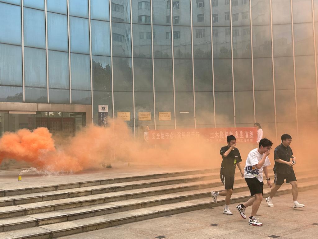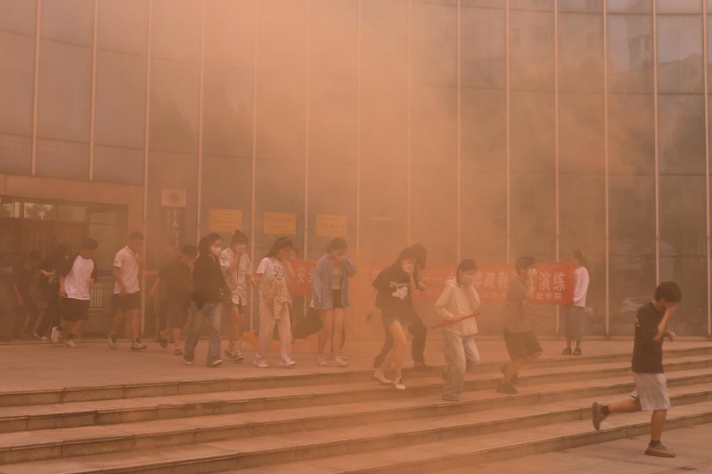 下午3:40,滚滚浓烟在楼宇间升起,呼鸣的警报声在土木楼响起。师生在听到警报声后迅速反应,捂住口鼻,弯着身体,从专业教室、实验室中有条不紊地鱼贯而出,沿着安全逃生指示标识,穿过浓烟,快速有序地疏散至安全地点。实战演练增强师生了在遇到火险等紧急突发情况时逃生、自护自救能力,提高师生应急应变能力。