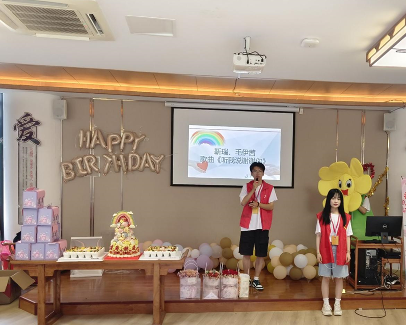 生日会现场被彩带彩旗和气球装点,桌面上摆着带有“温暖彩虹,爱心海洋”字样的生日蛋糕,屏幕上循环播放的生日歌,现场热闹非凡。生日会在志愿者们的精彩表演中拉开序幕,《听我说谢谢你》、《听妈妈的话》等歌曲舞蹈节目,传递着对家长们的敬意和对孩子们的关爱。志愿者们用优美的舞姿和动人的歌声,为现场的孩子家人们带来了一场视觉和听觉的盛宴。