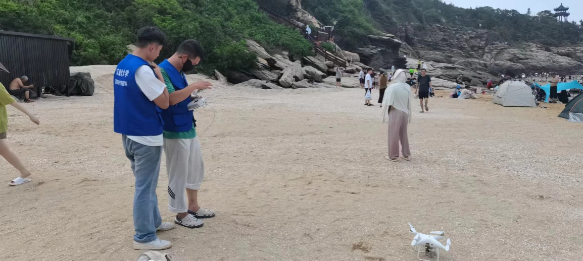 图为实践队员使用无人机影像了解沙滩海沙流失情况以及存在的隐患问题