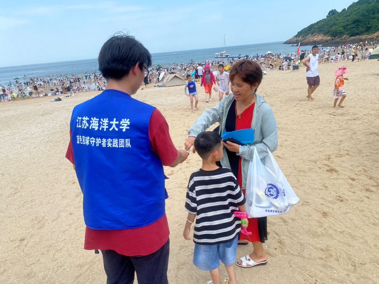 图为实践队员现场采访游客关于海洋灾害知识的了解并普及相关知识