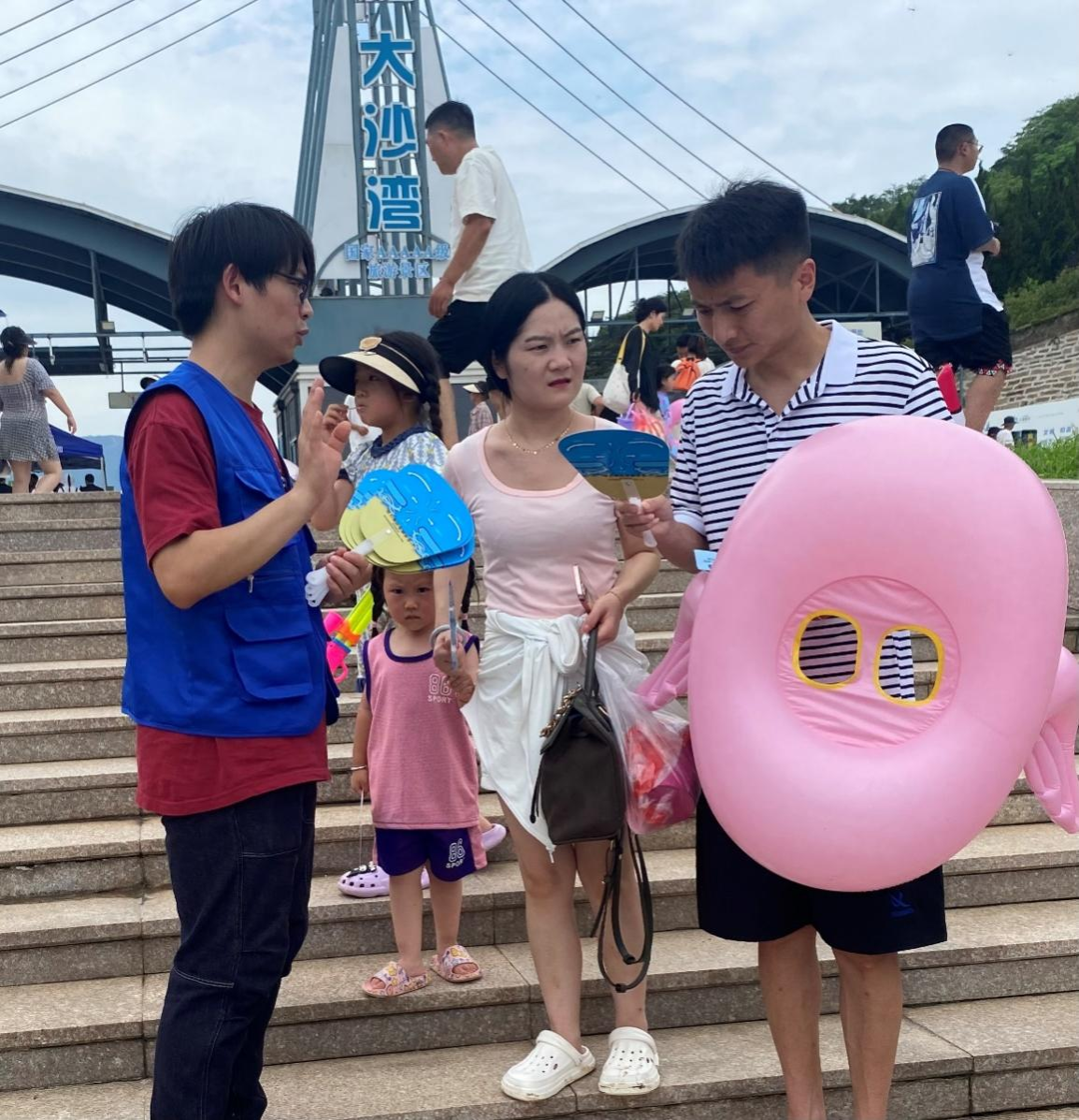 图为实践队员免费给游客发放带有“裂流”知识的扇子并进行海洋灾害知识普及