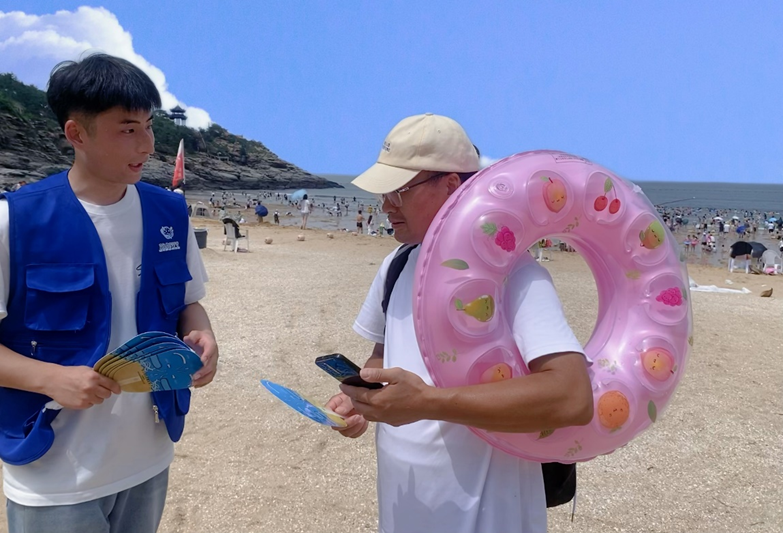 “裂流”是海滩溺水事故的最主要原因,也是海滩旅游的“隐形杀手”。“裂流”是在海浪和浅滩地形共同作用下,岸边的一股射束式的强劲水流,多以垂直或接近垂直于岸线的方向回流入海,可将人卷入深水。为了使游客清楚“裂流”的危害,实践成员免费给游客发放了有关“裂流”海洋灾害知识的扇子,现场采访游客关于海洋灾害相关常识的了解,同时还告诉旅客当发生“裂流”灾害危险时的正确逃离方式。