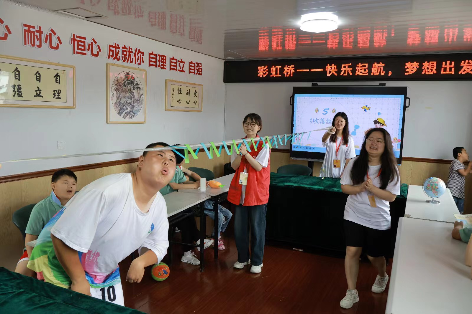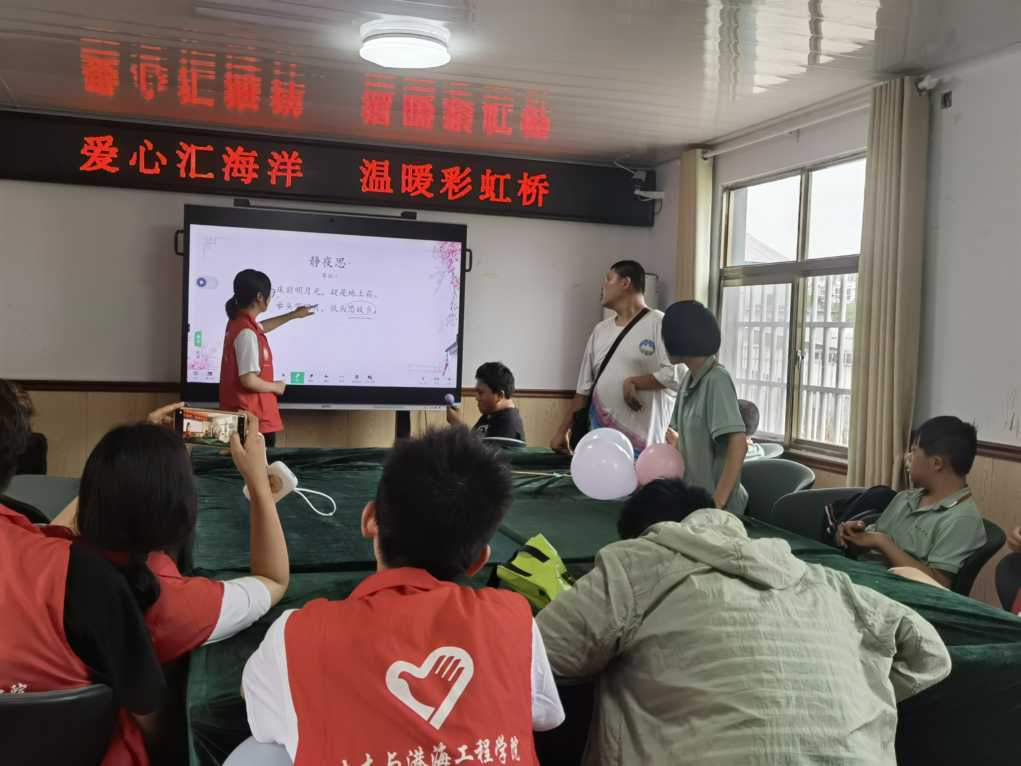 穿着志愿者服装、带着胸牌的志愿者此时此刻真真切切的融入进了彩虹桥、融入了家长和孩子们热情和诚意满满的氛围里。志愿者们与孩子们在活动室中共同歌唱、舞蹈,红歌的旋律与手势舞的节奏交织成一幅幅温馨的画面。
