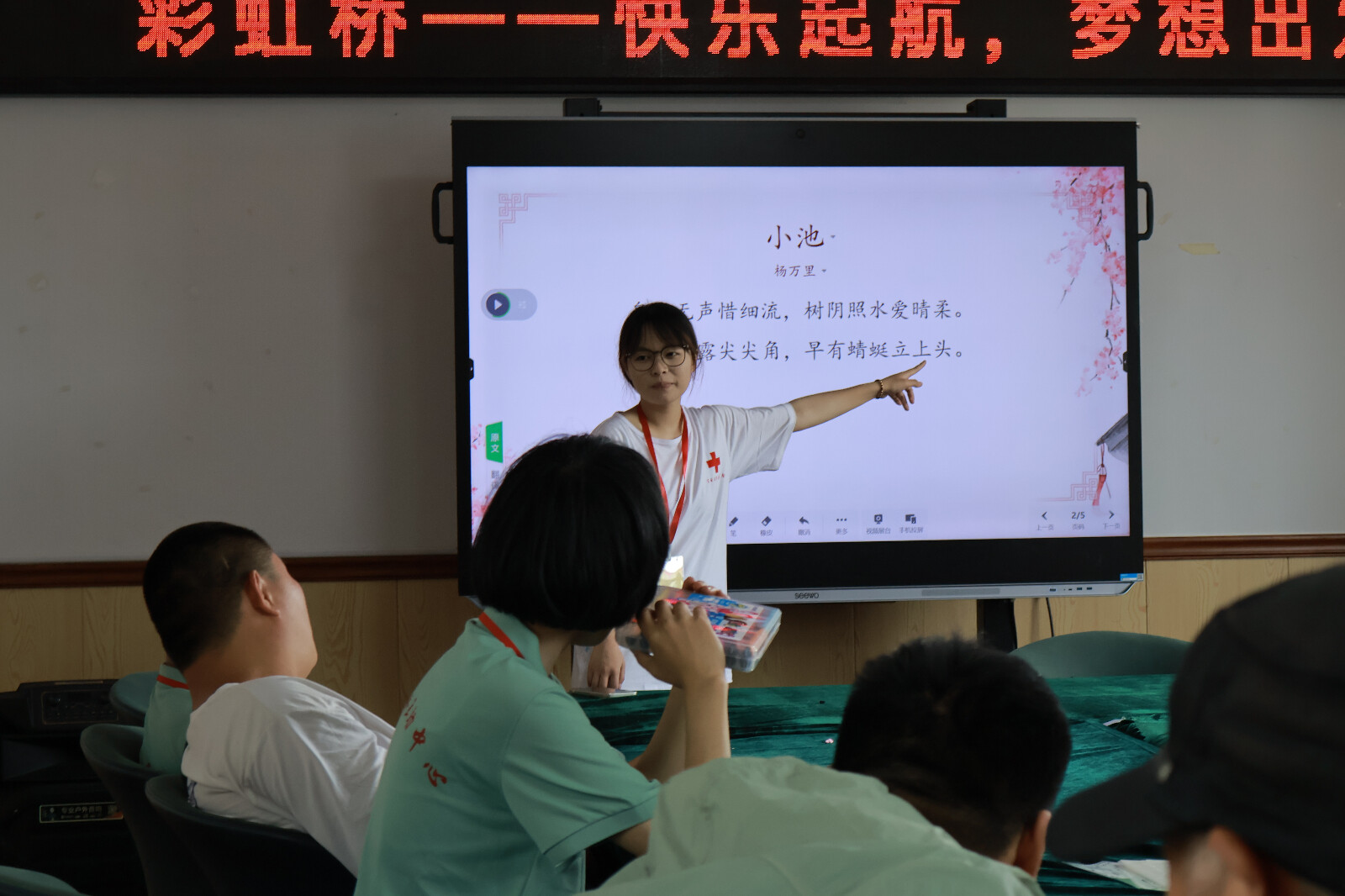 同时,将语数外课堂搬进彩虹桥,志愿者耐心教学古诗词,孩子们努力学习。孩子们一开始很难跟上,不过在一遍遍的带领与鼓励下,渐渐所有小孩都张开了嘴努力去学习。大家一起鼓励孩子们积极参与进课堂里。志愿者与孩子们小手拉大手,一同走过诗山、领略数字的变化与语言的魅力,在知识的海洋中徜徉。