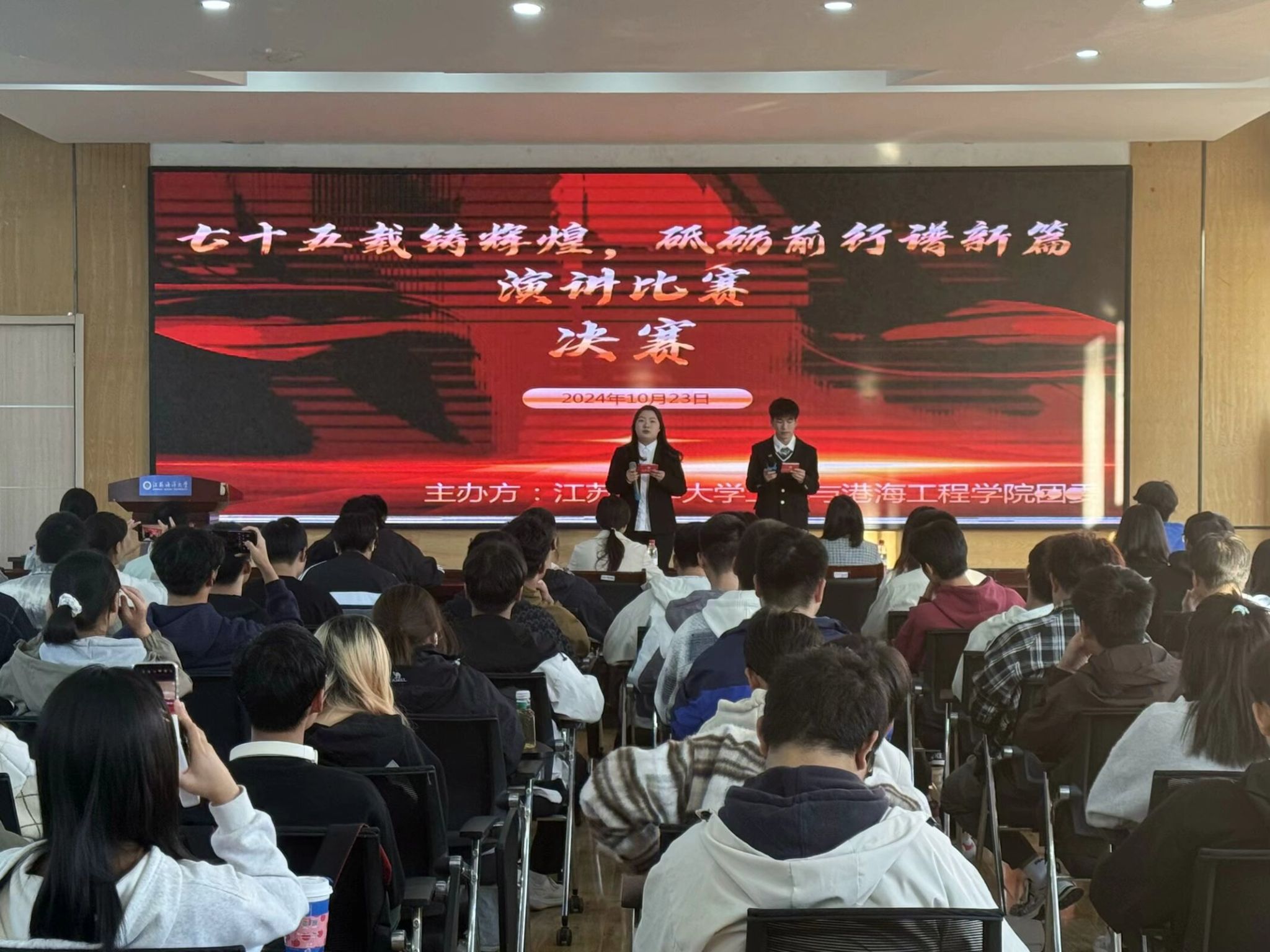 盛世华诞,荣耀中华。为庆祝中华人民共和国成立七十五周年,深入贯彻落实党的二十大精神,激发广大青年老员工的爱国热情和奋斗精神,10月23日下午,一场以 “七十五载铸辉煌,砥砺前行谱新篇” 为主题的演讲比赛在通灌校区诚意楼路演厅隆重举行。本次大赛由伟德国际bevictor1946团委组织部主办,邀请到理公司学工办主任尚凌宇、伟德国际bevictor1946团委书记卞辉、伟德国际bevictor1946辅导员钟孟晨、艺术设计公司团委大成主任王宇轩、文法公司团委大成主任张馨匀出席并担任评委。