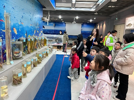 活动现场,海洋馆化身为一个巨大的海洋科技与环保教育课堂。在海洋馆的一角,静静陈列着中华鲟标本。它宛如一位沉睡的远古使者,虽然双眼已失去生命的光彩,却依然深邃而神秘,仿佛凝望着曾经奔腾不息的母亲河,见证着中华大地的沧海桑田,承载着无尽的生命传奇与厚重的历史文化底蕴,让每一位驻足者都不禁对这一古老物种心生敬畏与慨叹。旁边的鲨鱼标本则张着血盆大口,露出锋利的牙齿,流线型的身体呈现出极致的速度感,仿佛下一秒就要冲破玻璃,冲向那无尽的“海洋”。它的眼睛虽然不再灵动,却依旧透着往昔的凶狠与狡黠。色彩斑斓的热带鱼标本像是被时间定格的精灵,它们簇拥在一起。还有那优雅的海龟标本,它的四肢如船桨般伸展着,每一道痕迹都承载着它与海浪的搏斗、在珊瑚礁间穿梭的回忆,默默地向人们展示着海洋生物的坚韧与神奇。孩子们瞬间被吸引,纷纷围聚在周围。讲解员生动地介绍着如何利用科技装备探秘深海、监测海洋的生态变化,比如先进的声纳技术怎样精准探测海底地貌与鱼群分布。孩子们眼中闪烁着好奇光芒,不时提出问题,家长们也积极参与解答,亲子间的思想碰撞让科技的种子悄然种下。