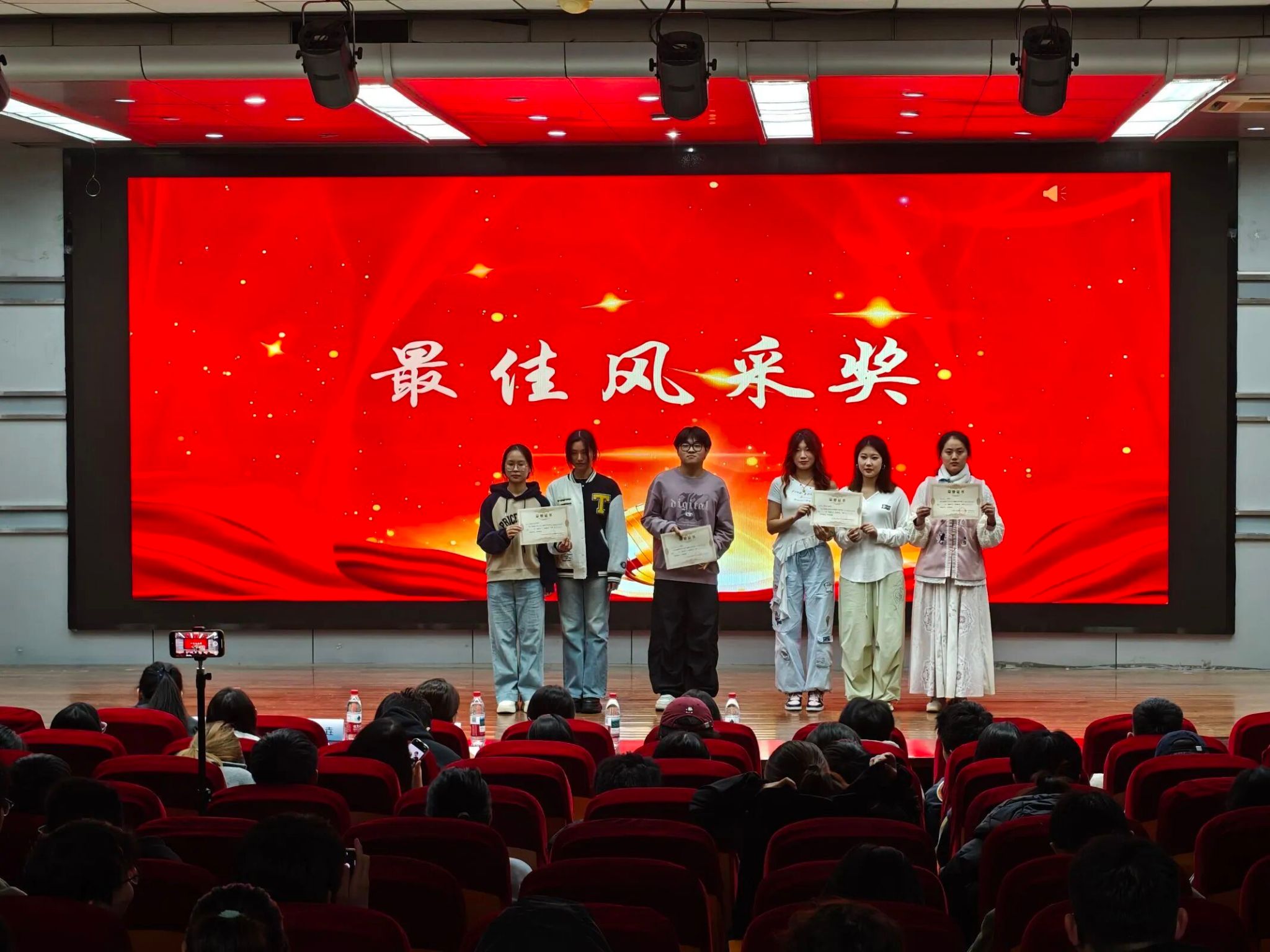 经过近一个多小时的激烈角逐、专业评委的严谨评审以及大众投票数据的公正统计,活动最终评选出三大类奖项,为优秀选手的精彩表现加冕。其中,《like Jennie》《不重逢》等四组节目凭借出色的舞台呈现与专业水准,荣获“最具风采奖”;舞蹈串烧以超高人气、《舍得》以动人演绎分别斩获“最佳人气奖”;而将创意与艺术完美融合的《弱水三千》则成功摘得“最佳创意奖”。在颁奖环节中,评委老师们亲手为获奖选手颁发荣誉证书,并与所有获奖选手共同合影留念。闪光灯下,每一张笑脸都定格着属于青春的荣耀时刻。