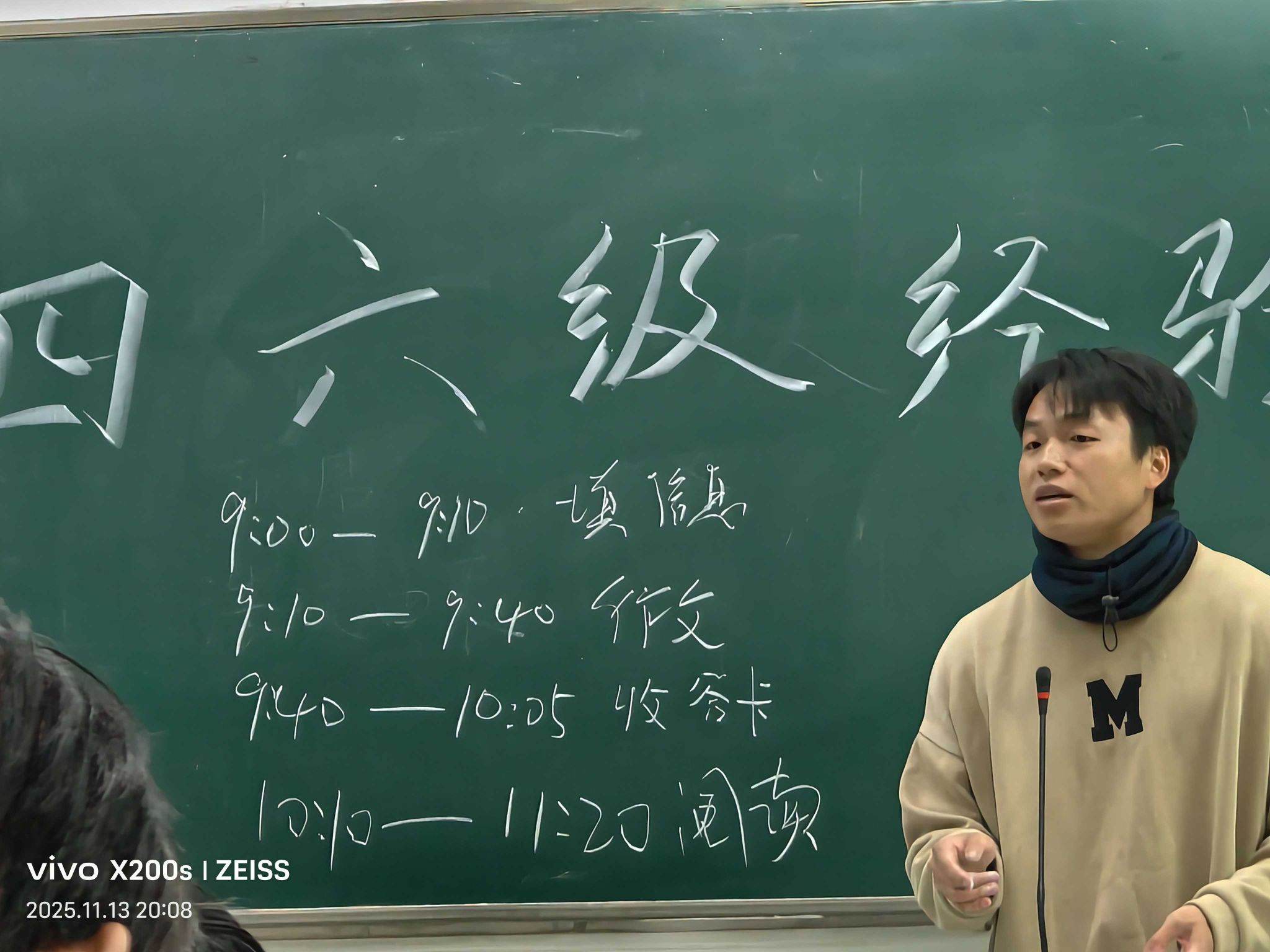 随后,鄢忠权为同学们详细梳理了四级考试的完整流程及关键注意事项。他以条理清晰的逻辑,详尽介绍了从入场、试音,到分发试卷、各题型作答顺序,再到收卷的全过程,使同学们对考试有了更加直观且全面的了解。